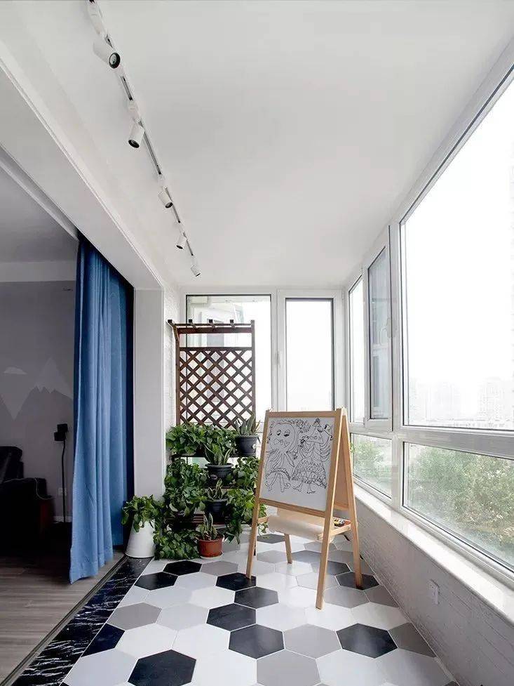 六角砖造价贵,在阳台这样小面积的地方使用可节省成本,也非常美观。六角砖黑白灰是最常见的,还有一些其他彩色的,这要看你自己的喜好,以及与阳台的搭配。