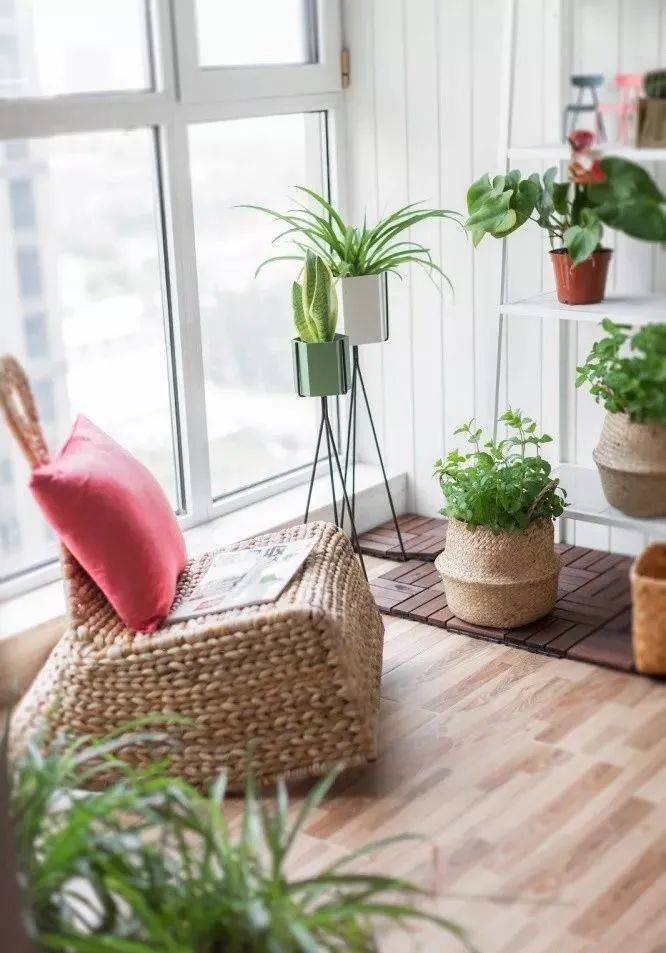 把阳台抬高:这种做法是把阳台抬高,铺上地板后,直接作为矮地台使用,随便放个小桌子,几个小坐垫抱枕就能变成一个休闲区。